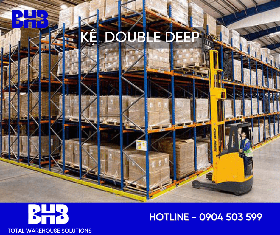 Kệ Double Deep là một loại kệ chứa pallet đặc biệt, có hai mặt lưng đối nhau tiết kiệm tối đa diện tích cho lối đi, sử dụng chân trụ omega chắc chắn. Kệ có tải trọng nặng trung bình từ 2000 – 5000 kg/tầng. Số pallet chứa hàng từ 4 – 10 pallet/tầng