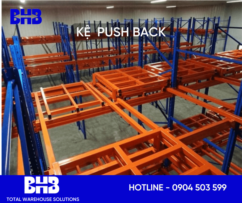 Kệ Push Back có cơ chế đẩy sau, các kiện hàng khi đưa vào sau sẽ đẩy kiện hàng trước nó vào sâu trong dãy. Khi lấy một kiện hàng ra cơ chế tự động của kệ sẽ đẩy kiện hàng bên trong ra ngoài thay thế vị trí của kiện hàng vừa lấy. Tải trọng của kệ từ 1000 – 2000 kg/tầng tương ứng với 2 – 4 pallet mỗi hàng.