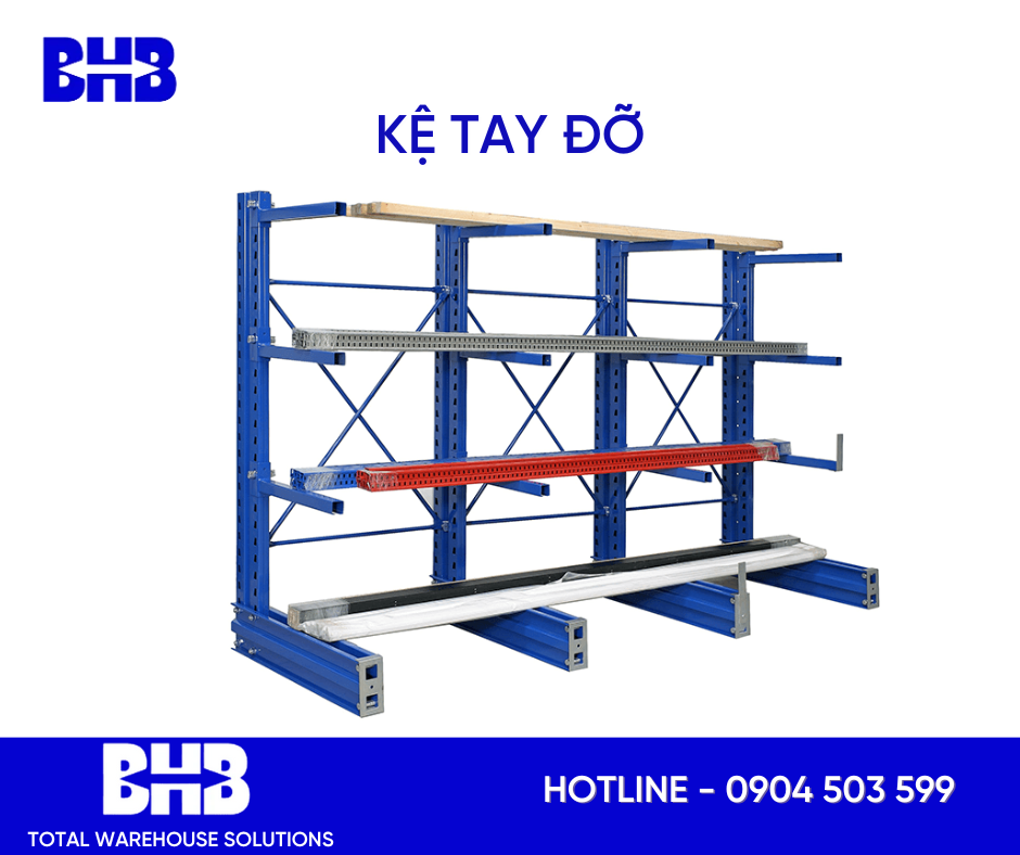 Kệ tay đỡ thường được dùng để lưu trữ các loại hàng hóa, sản phẩm, vật tư có kích thước dài và cồng kềnh như: thanh gỗ, ống nhựa, ống thép, thảm, đồ nội thất, cuộn vải,… với tải trọng nặng lên đến 3000 – 5000 kg/tầng thậm chí hơn.