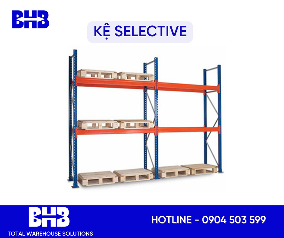 Kệ selective là loại kệ được sử dụng phổ biến nhất trong các kho xưởng hiện nay. Mỗi tầng kệ có sức chứa lên đến 4000kg/pallet, có thể nhập xuất hàng bằng tay hoặc sử dụng các loại xe nâng hàng đều được.