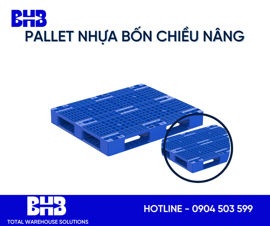Pallet nhựa 4 chiều nâng được sử dụng phổ biến trong nhà máy và nhà kho. Thích hợp cho hàng hóa trọng tải nặng (hàng hóa lên đến 10000 Kg). Và rất thích hợp cho việc xếp chồng lên nhau hay xếp lên kệ. Vì thế nên sản phẩm này chuyên dùng cho các ngành Điện & Điện Tử, Thực Phẩm & Đồ Uống, Hóa Chất, Nhựa & Hóa Dầu, Phân Bón, Bột Mỳ …Thích hợp với cả Kho Mát và Kho Lạnh.