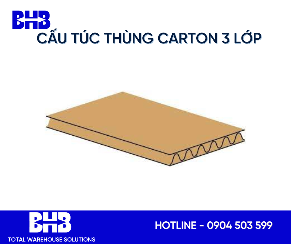 Cấu tạo bằng 2 lớp giấy phẳng và 1 lớp song ở giữa. Thường được sử dụng đựng các mặt hàng có khối lượng < 10kg. Thùng Carton 3 lớp sóng A, sóng B, sóng C, sóng E đủ quy cách các loại.
