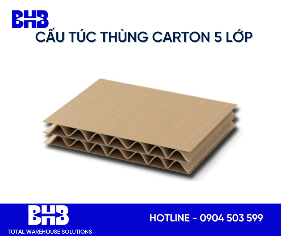 Thùng carton 5 lớp là loại thùng carton thông dụng nhất trên thị trường được cấu tạo bao gồm: